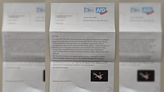 Am vergangenen Dienstag veröffentlichte der Itzehoer Propst Steffen Paar auf Instagram ein anonymes Drohschreiben, das an ihn gerichtet war. In dem Brief droht eine selbst ernannte Gruppe namens Sturmfront Schleswig-Holstein – Patriotischer Untergrund der AfD und Bauernschaft, man kenne seinen Wohnort und seinen Partner. Die Botschaft des Schreibens ist eindeutig: „Fühlen Sie sich nirgendwo sicher.“ Begleitet wird die Drohung von einem Waffenbild sowie den Logos der AfD und der historischen schleswig-holsteinischen Landvolk-Bewegung, die in den 1920er-Jahren für Sprengstoffanschläge bekannt war.
