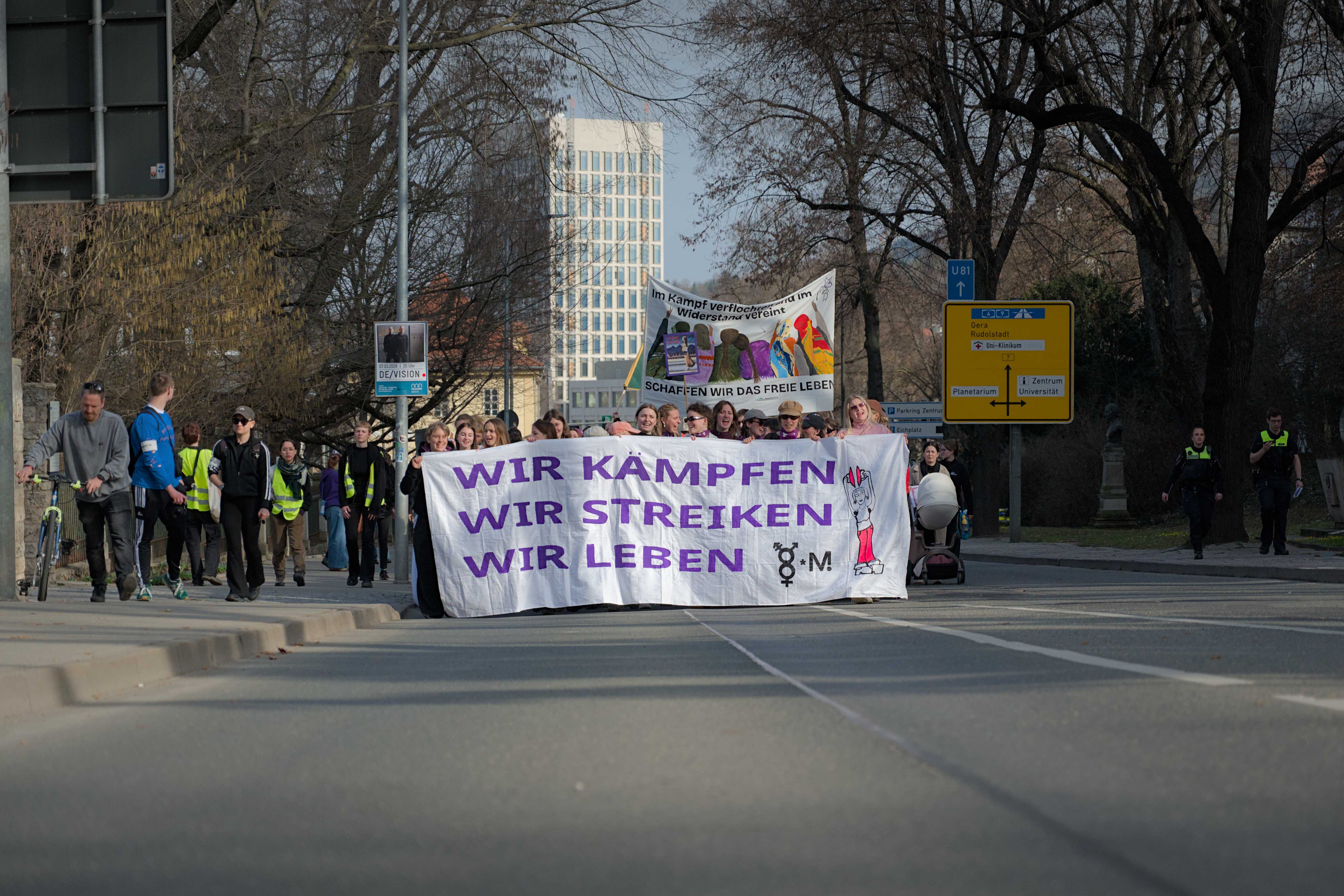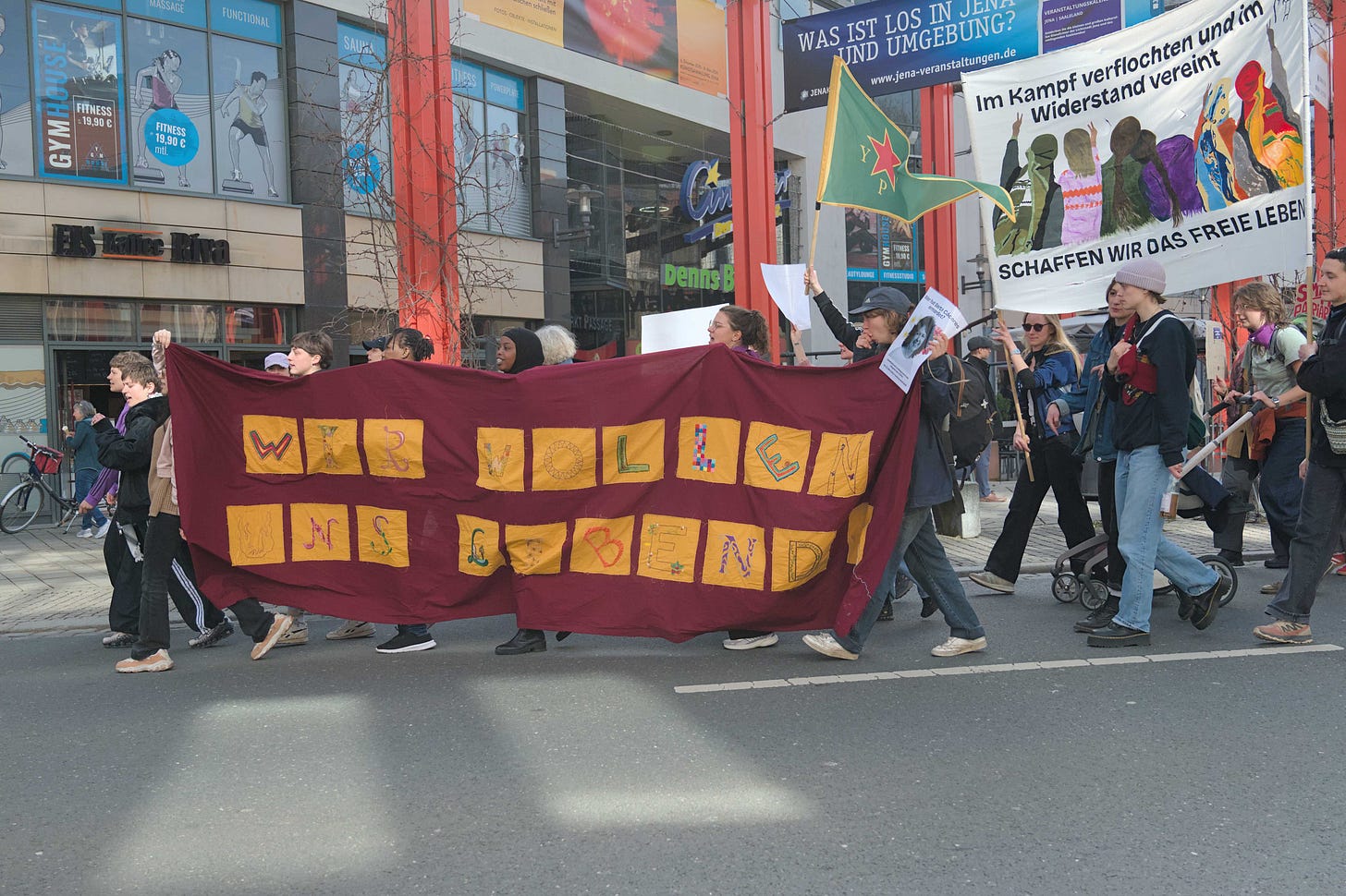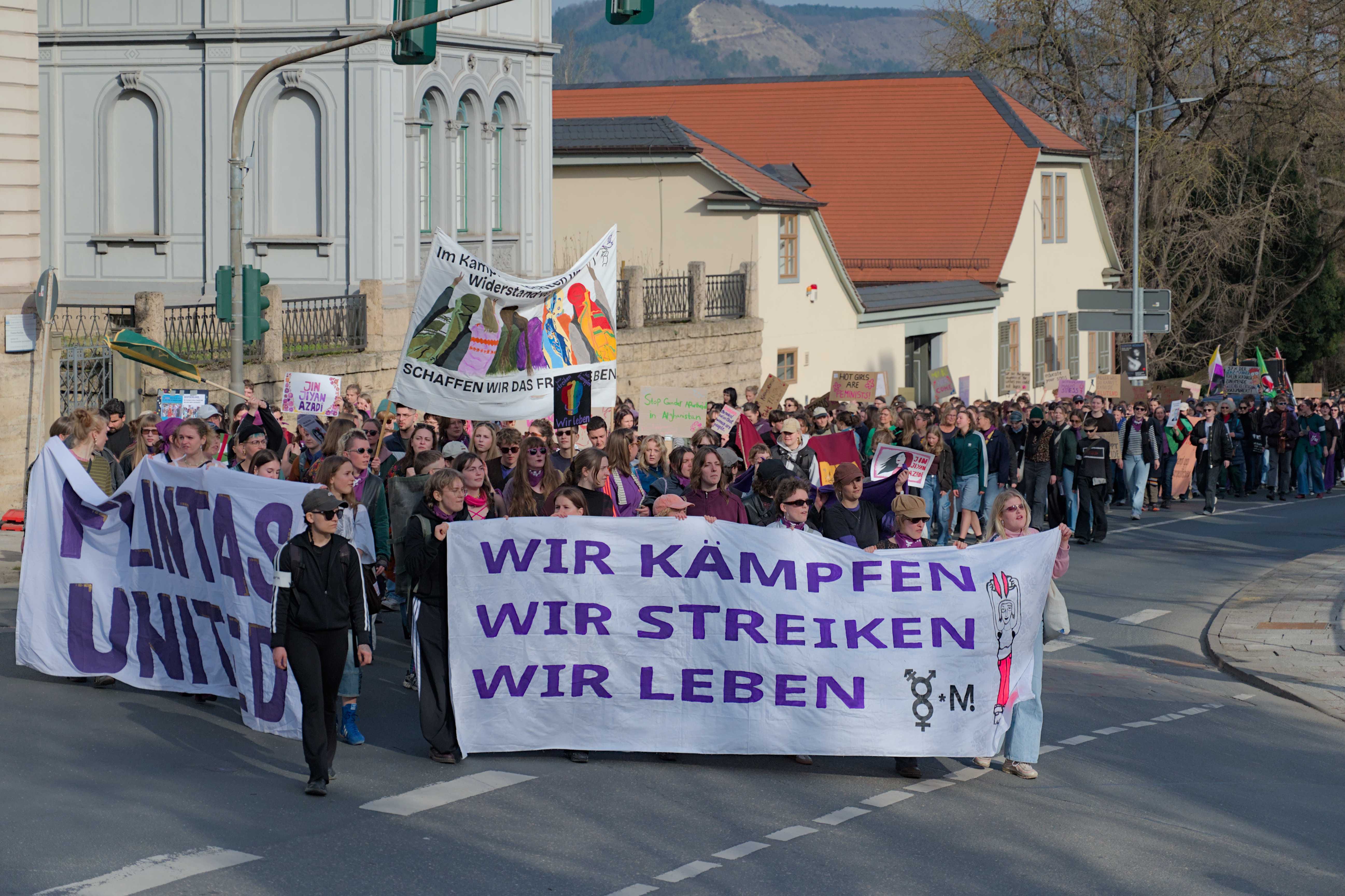 Zum internationalen feministischen Kampftag gingen in ganz Deutschland Menschen auf die Straße. In Jena rief ein breites Bündnis unter dem Motto „Wir kämpfen, wir streiken, wir leben“ zur Demonstration auf. An dieser nahmen über 1.000 Menschen teil. Zuvor gab es Brunch und Workshops, auch für Kinderbetreuung war gesorgt.