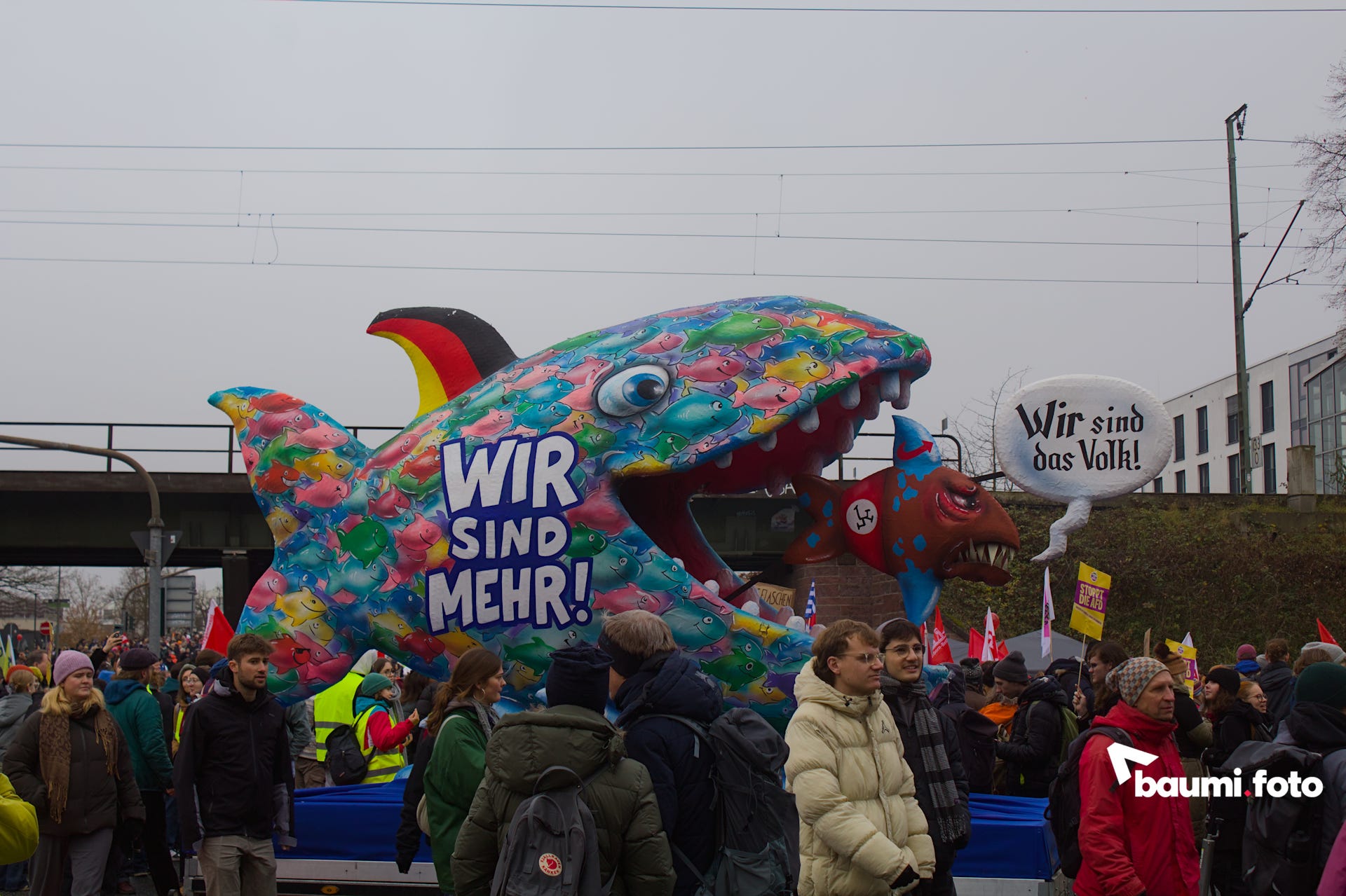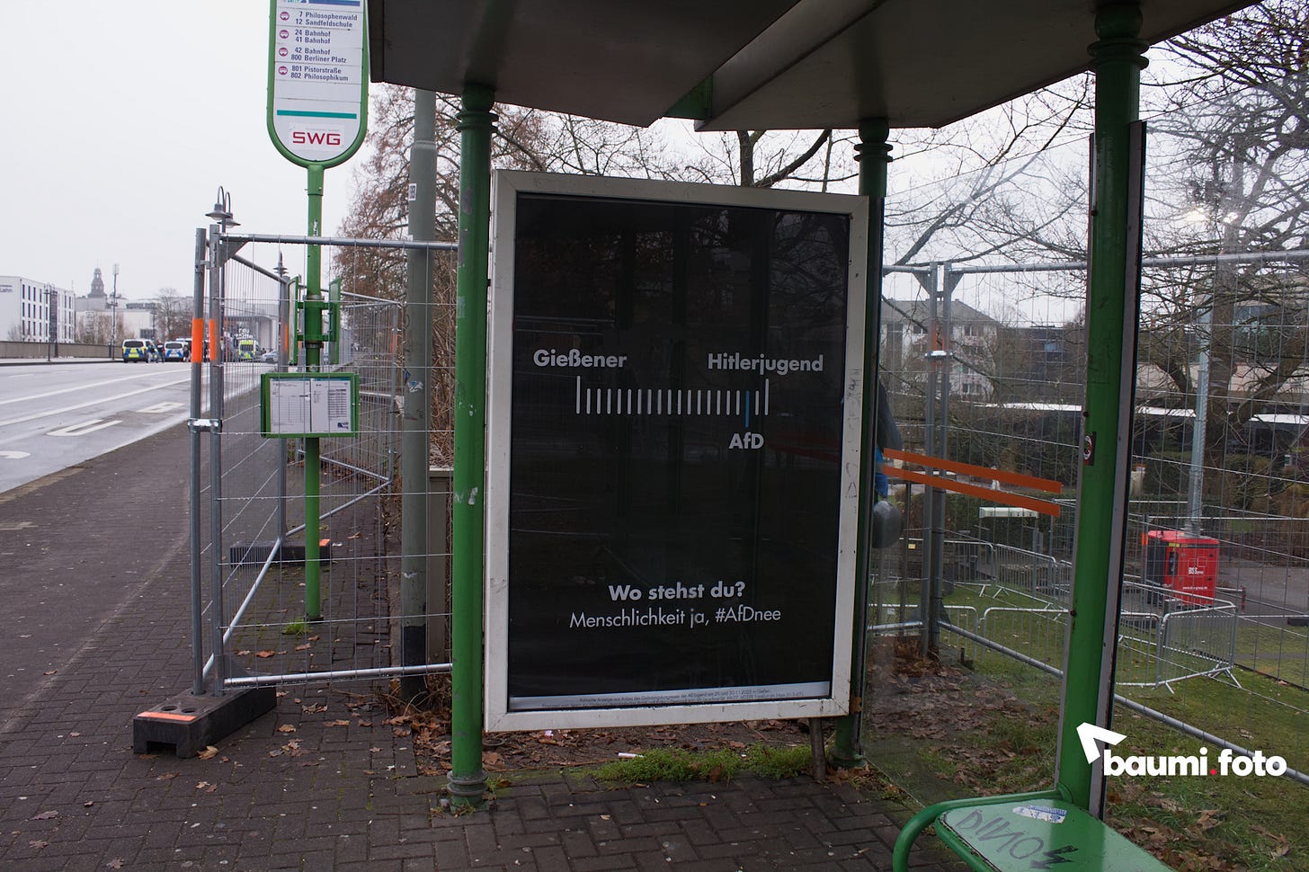 Die Weststadt hingegen wirkte wie eine kleine Geisterstadt mit starker Polizeipräsenz. Neben einer Adbusting Aktion (dem austauschen von Werbeplakaten gegen politische Botschaften), befand sich nur der Adenauer SRP+, als letzter Teil der Gegenproteste, im Stadteil. Der Protestbus glänzte mit einer Auswahl an verschiedenen Aktionen, wie einer Liveübertragung des Parkplatzes des Messegeländes, auf welchem die AfDler*innen ankamen. Dazu spielte er Hitlers Einmarschmusik. Des weiteren konnte man ihn natürlich von innen besichtigen.