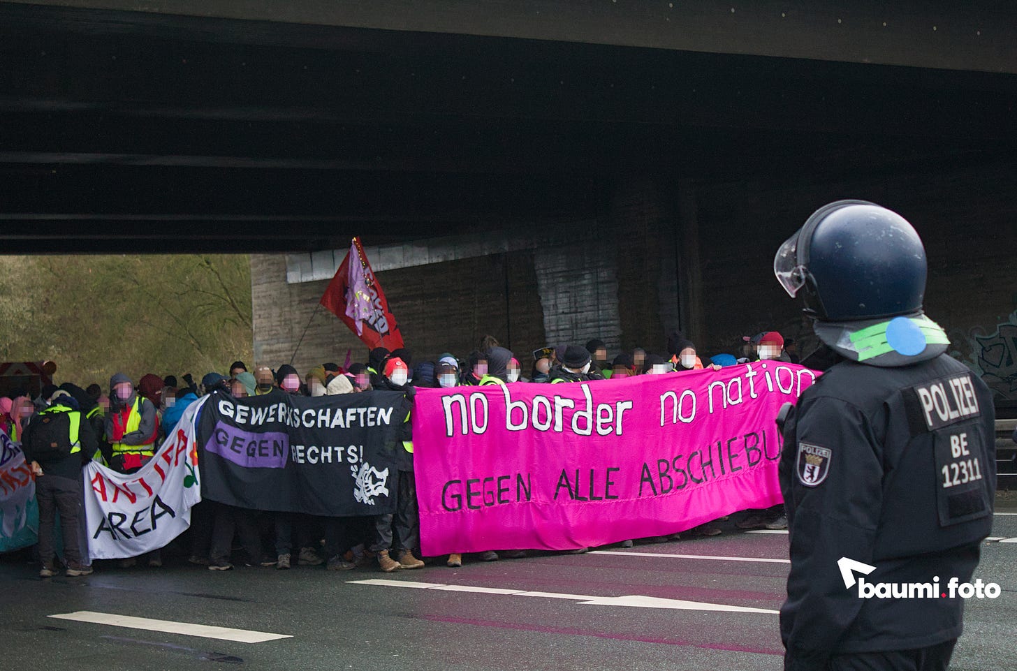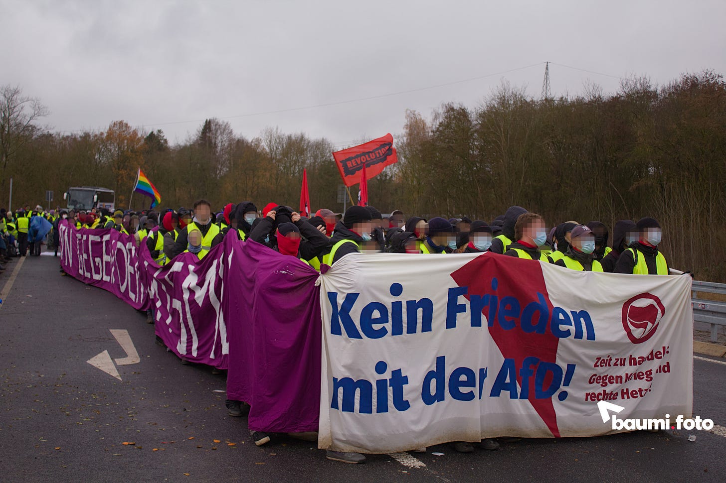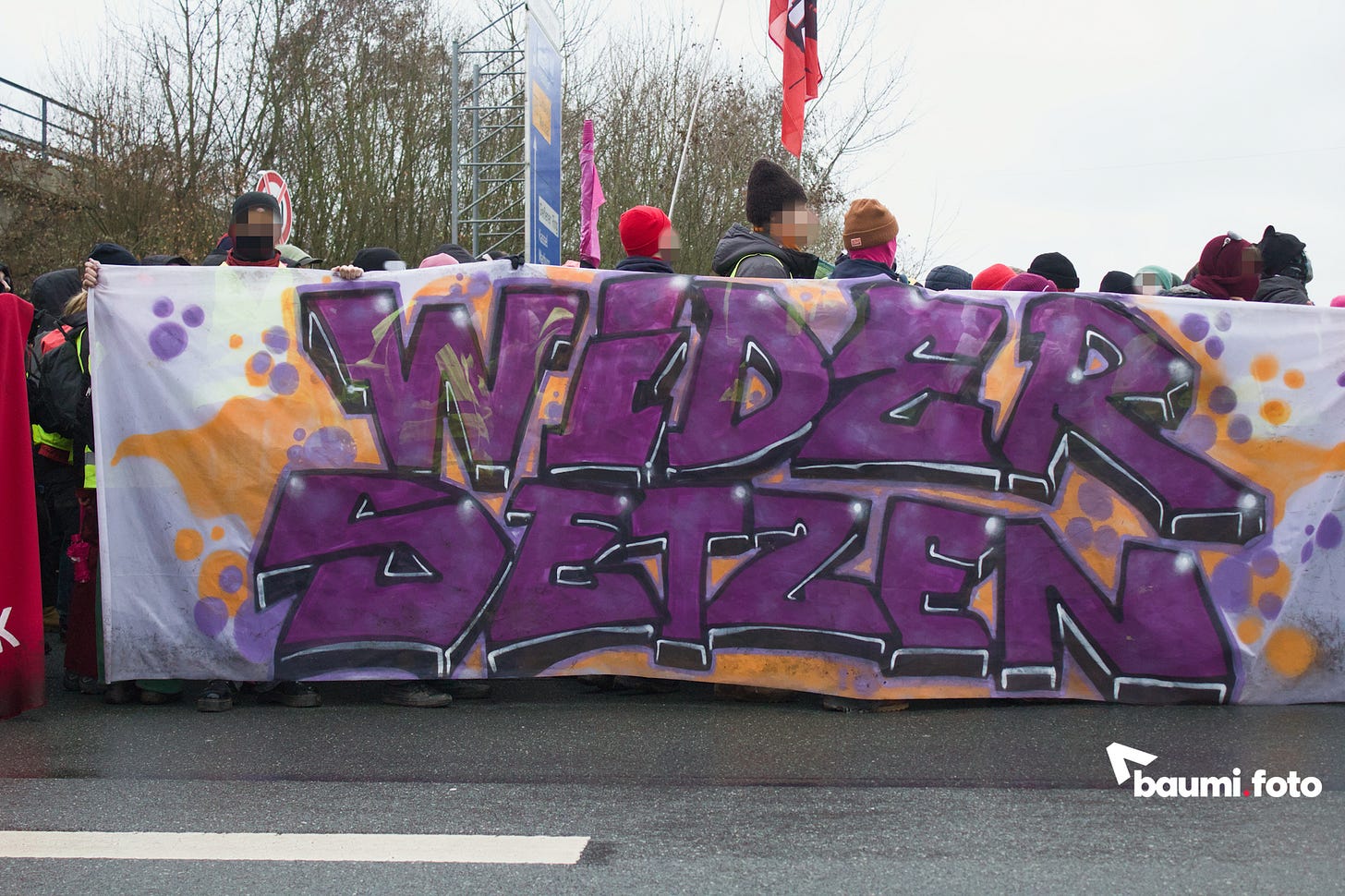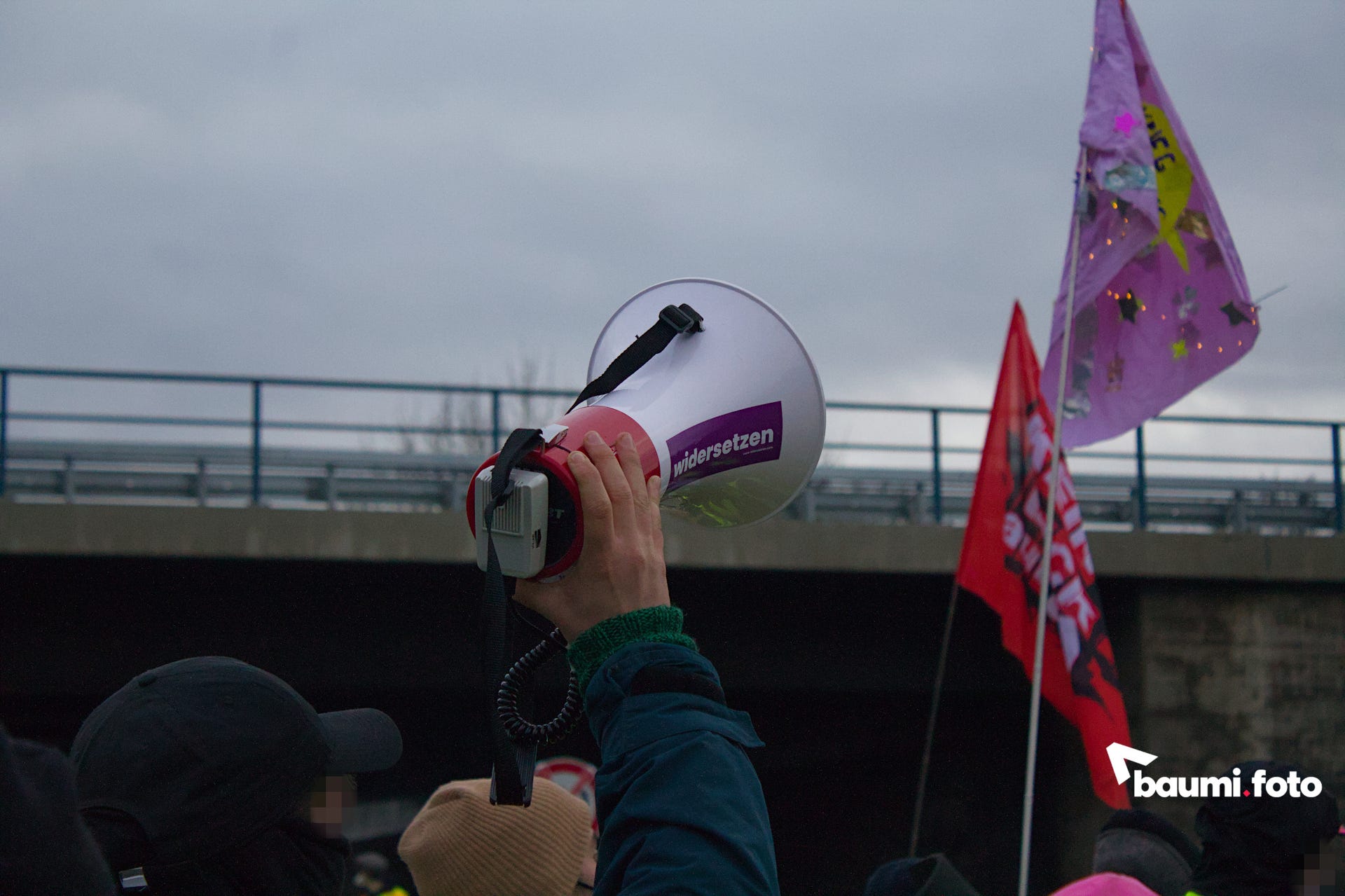 Während die Blockierenden auf der Ausfahrt weiterhin auf eine sinnvolle Lösung durch die Polizei warteten, kam in die Gruppe auf der Bundesstraße Bewegung hinein. Einige hundert Meter die Straße hinunter, war ein abgesplitterter Teil ihres ursprünglichen “pinken Fingers” aufgetaucht und man wollte sich wieder zusammenfinden. Deshalb setzte sich ein großer Teil in Bewegung, weg von der Kreuzung, wurde aber nach einigen Metern gestoppt.