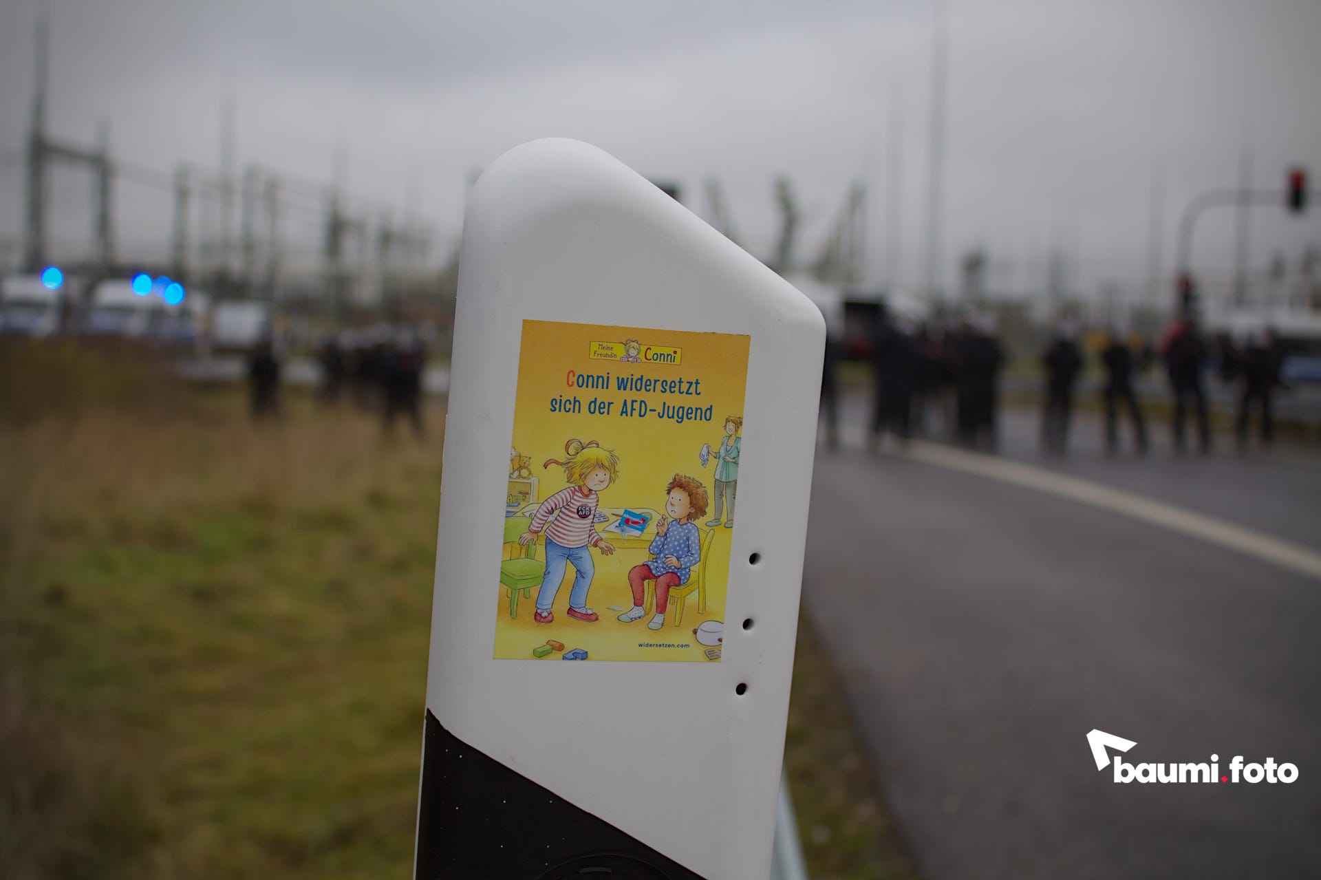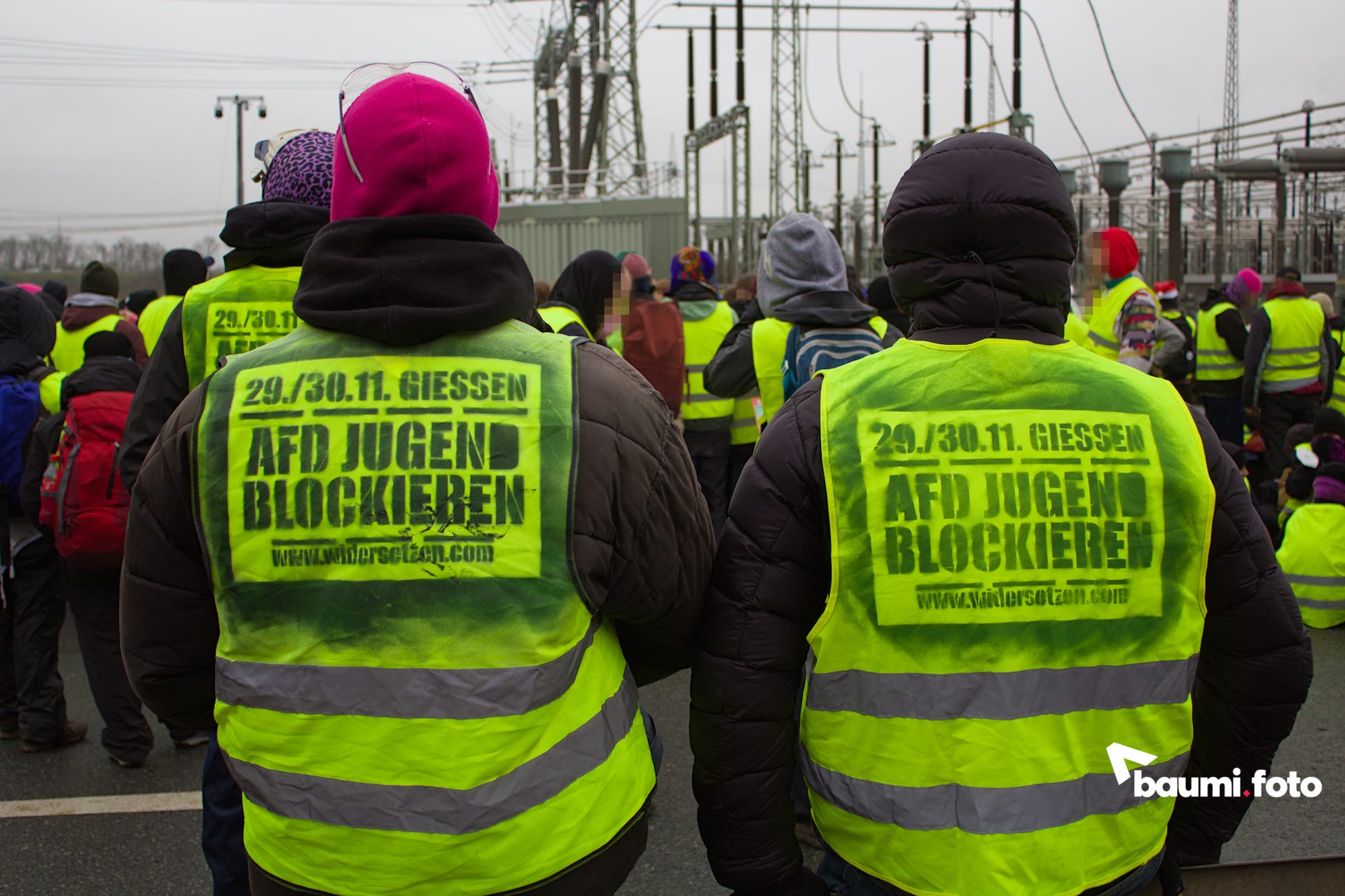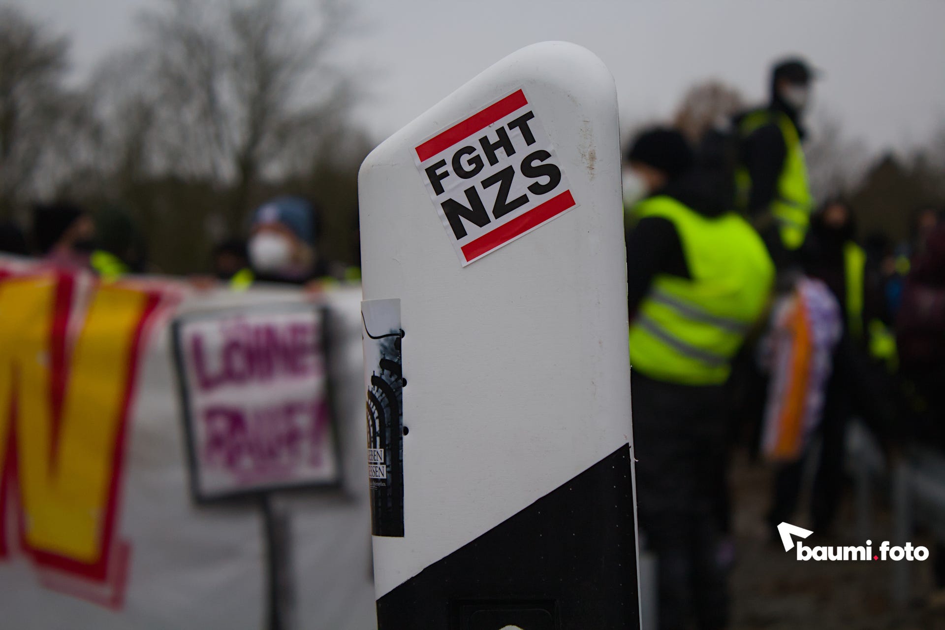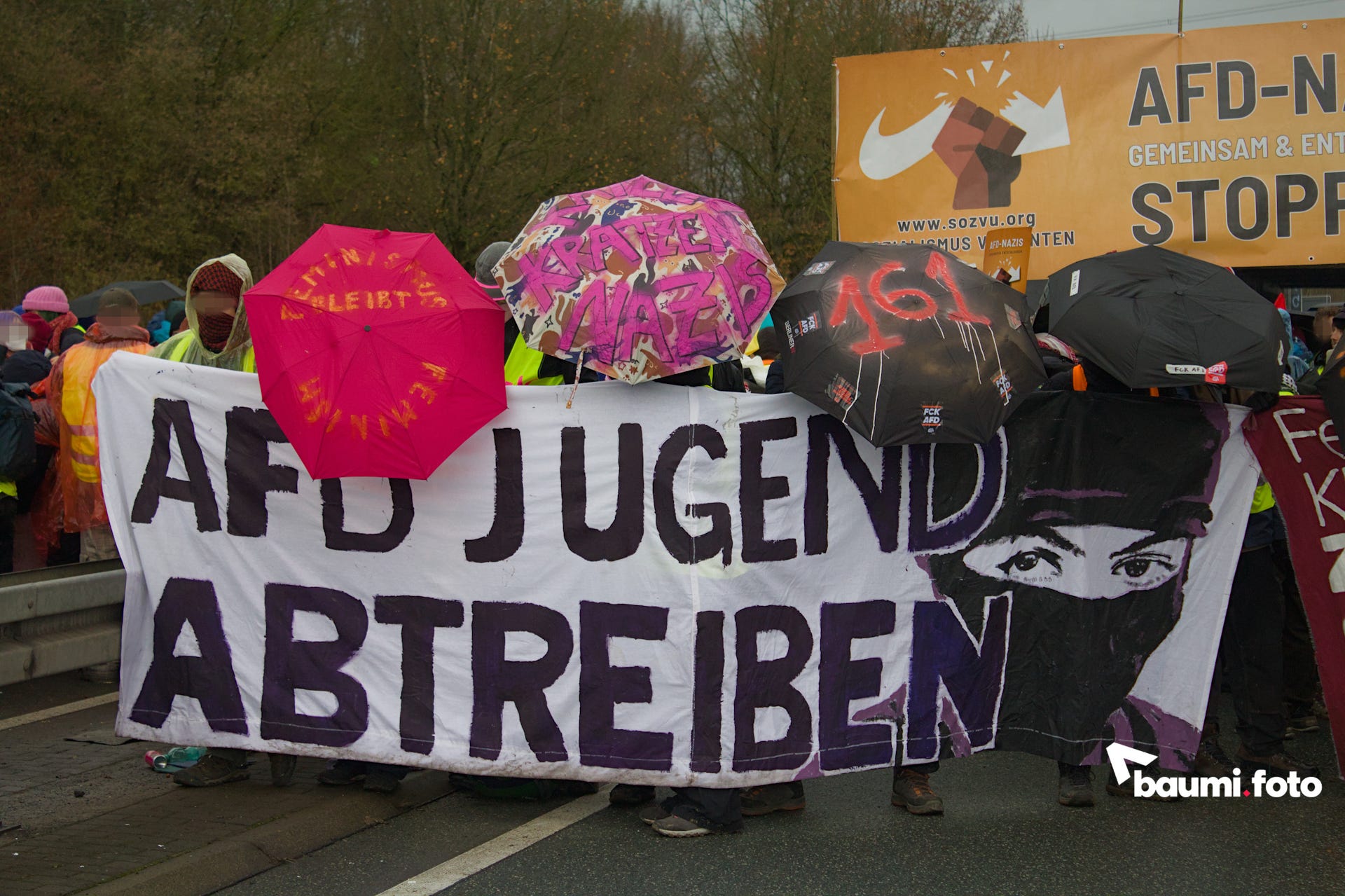 Während die Blockierenden auf der Ausfahrt weiterhin auf eine sinnvolle Lösung durch die Polizei warteten, kam in die Gruppe auf der Bundesstraße Bewegung hinein. Einige hundert Meter die Straße hinunter, war ein abgesplitterter Teil ihres ursprünglichen “pinken Fingers” aufgetaucht und man wollte sich wieder zusammenfinden. Deshalb setzte sich ein großer Teil in Bewegung, weg von der Kreuzung, wurde aber nach einigen Metern gestoppt.