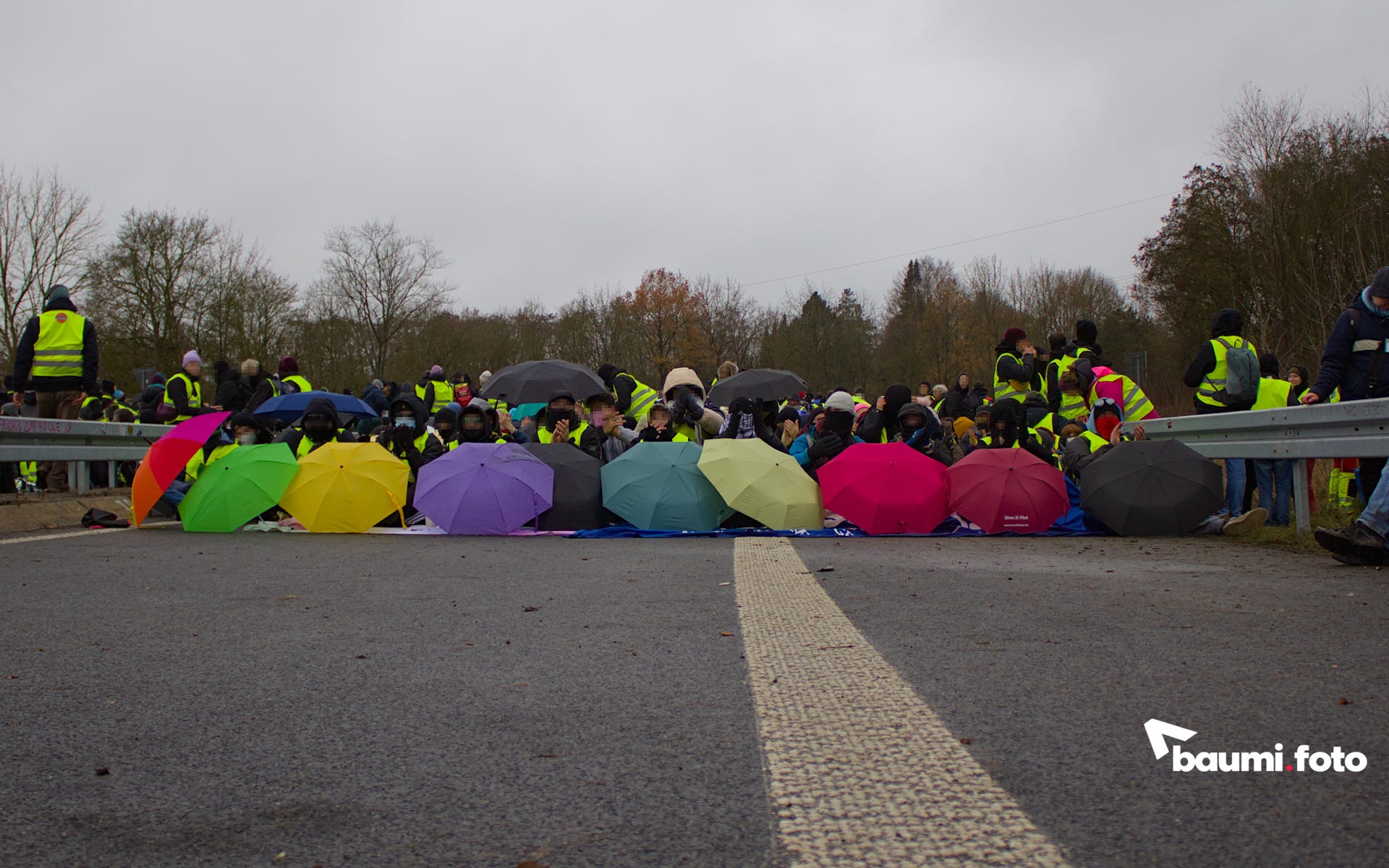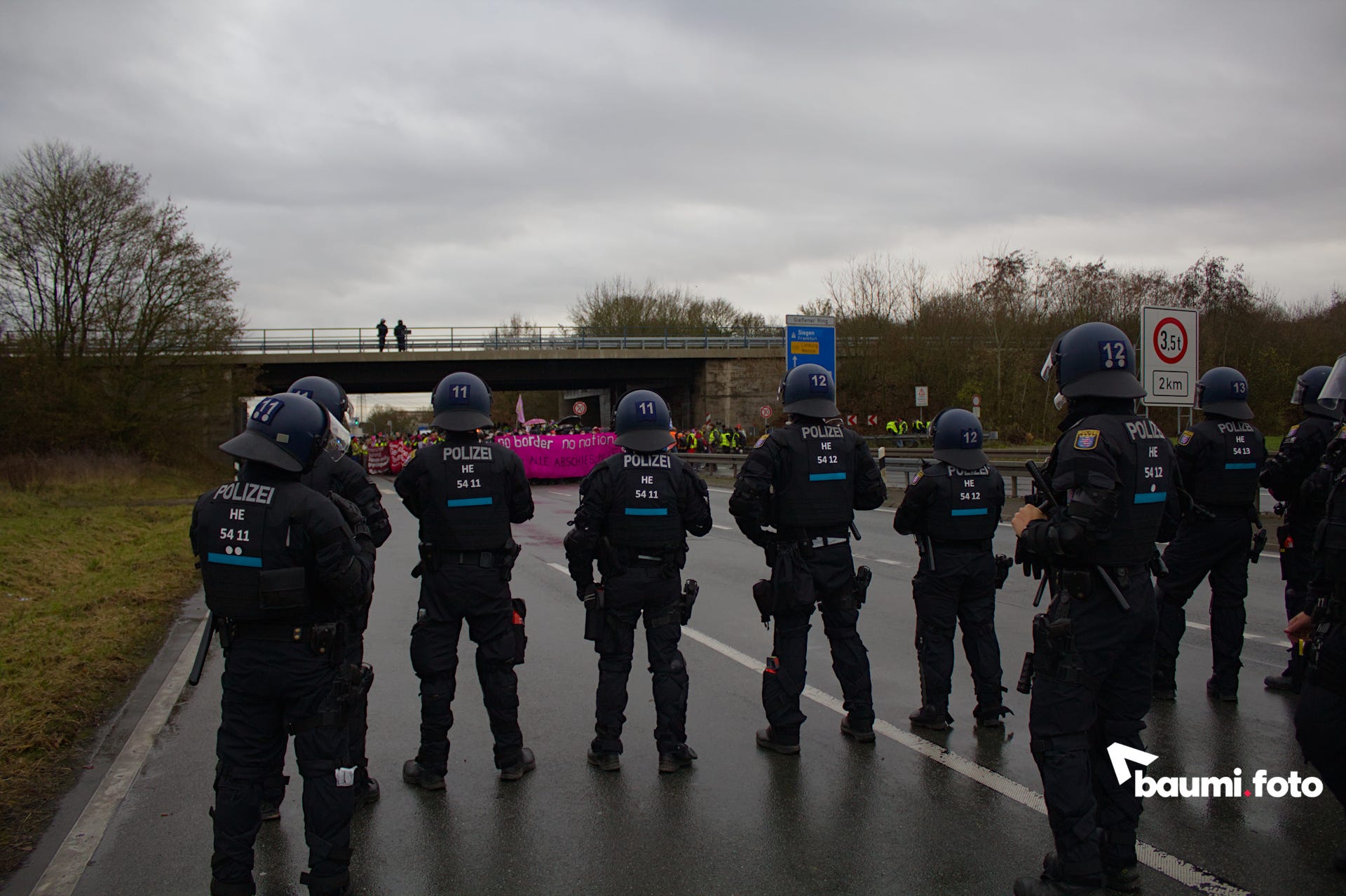 Während die Aktivisti auf der Bundesstraße sich kaum zu bewegen schienen, ging es auf der Auffahrt etwas dynamischer zu. Um zwölf Uhr stand man noch auf beiden Seiten der Fahrbahn, gegen 13 Uhr setzte sich schließlich ein Großteil der Menschen auf die Fahrbahn und gegen 14 Uhr formierten sie sich schließlich, mit der Forderung laufen zu dürfen, zu einer Demonstration.