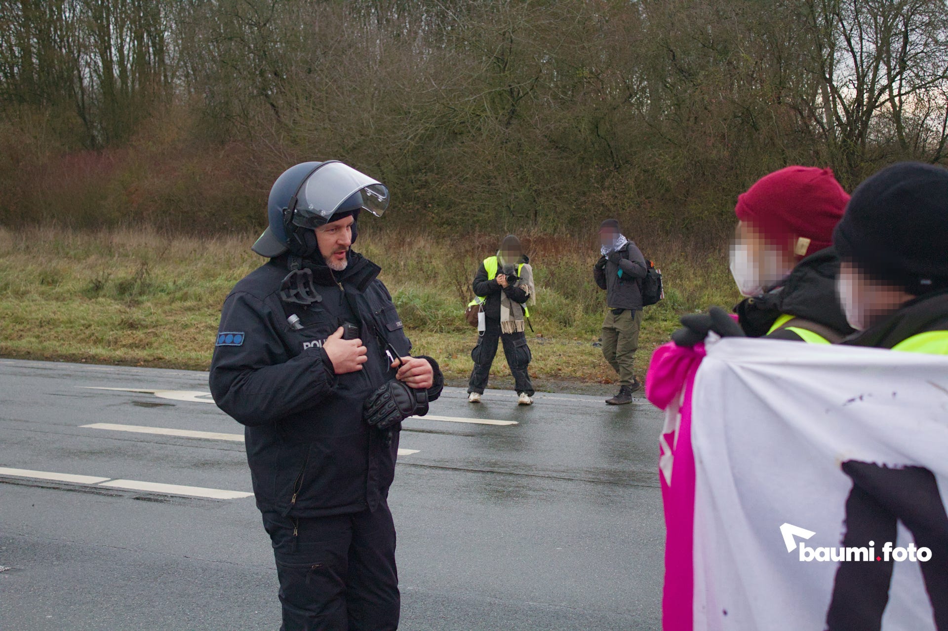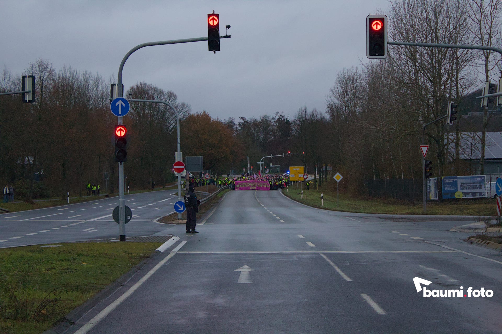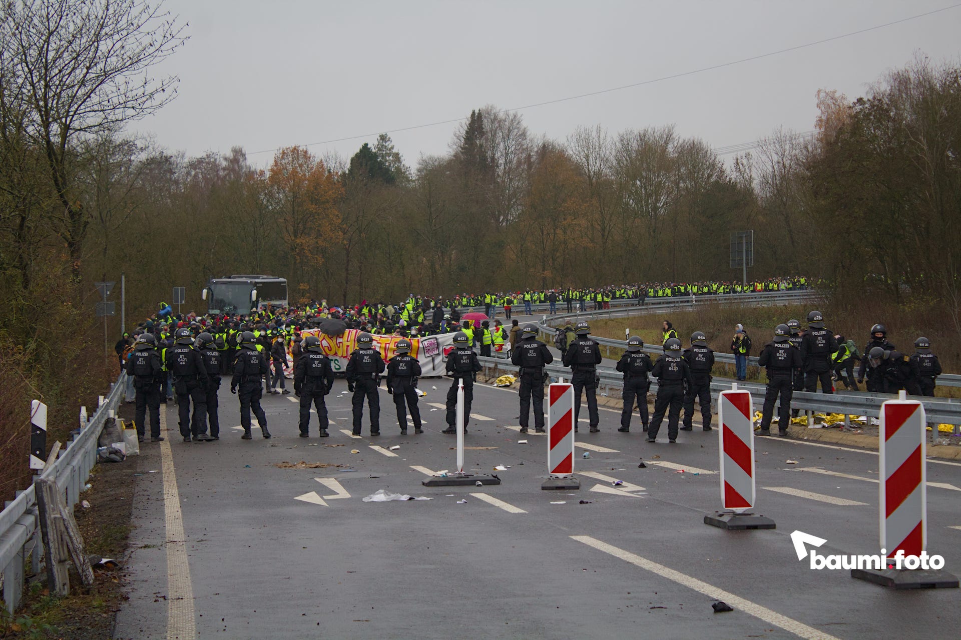 Die Kreuzung zwischen der Autobahnabfahrt und der blockierten Bundesstraße war durch die Polizei versperrt, was den Wald zwischen den beiden Straßensperren zum einzigen Durchgang machte.