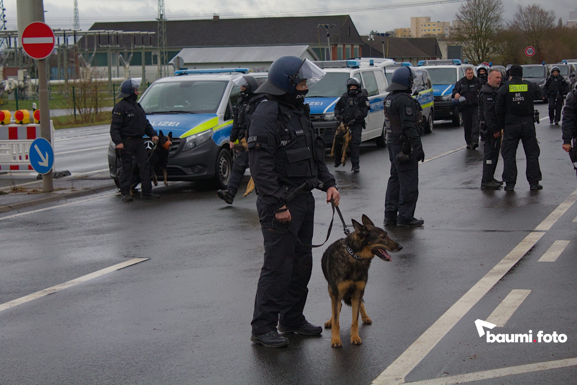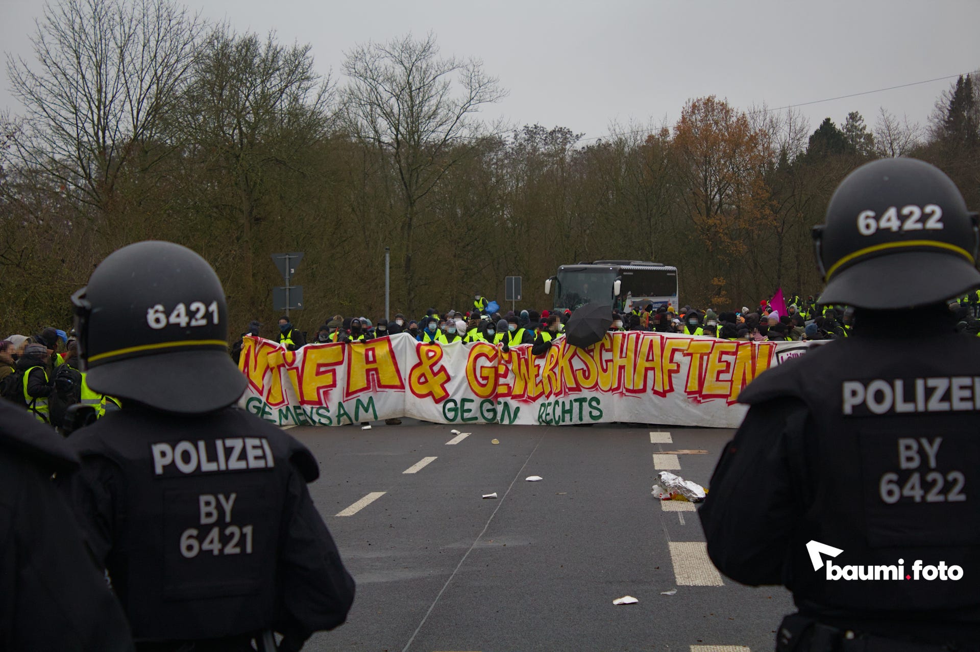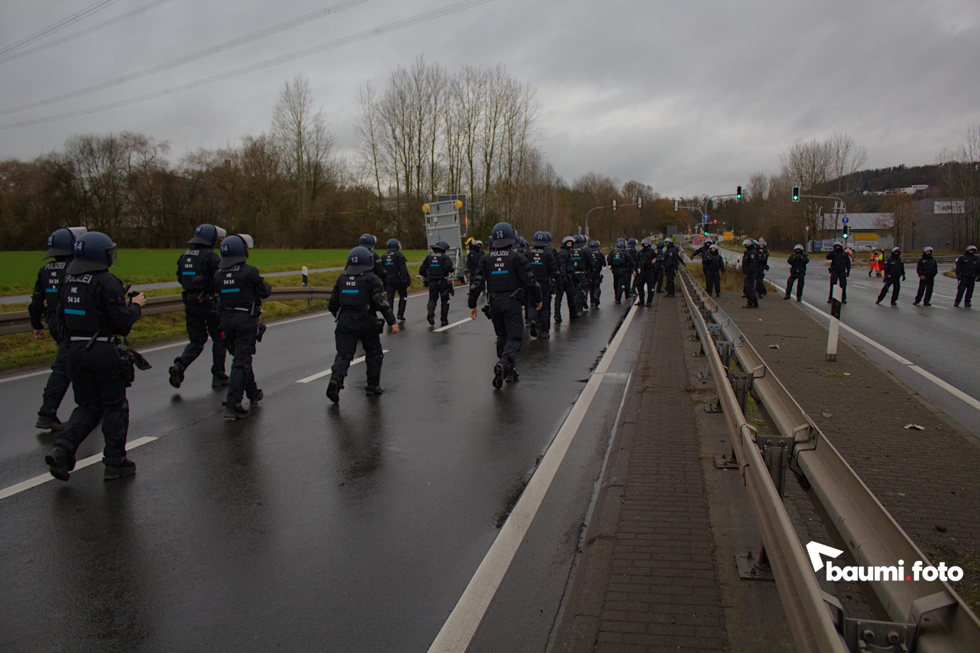Die Kreuzung zwischen der Autobahnabfahrt und der blockierten Bundesstraße war durch die Polizei versperrt, was den Wald zwischen den beiden Straßensperren zum einzigen Durchgang machte.