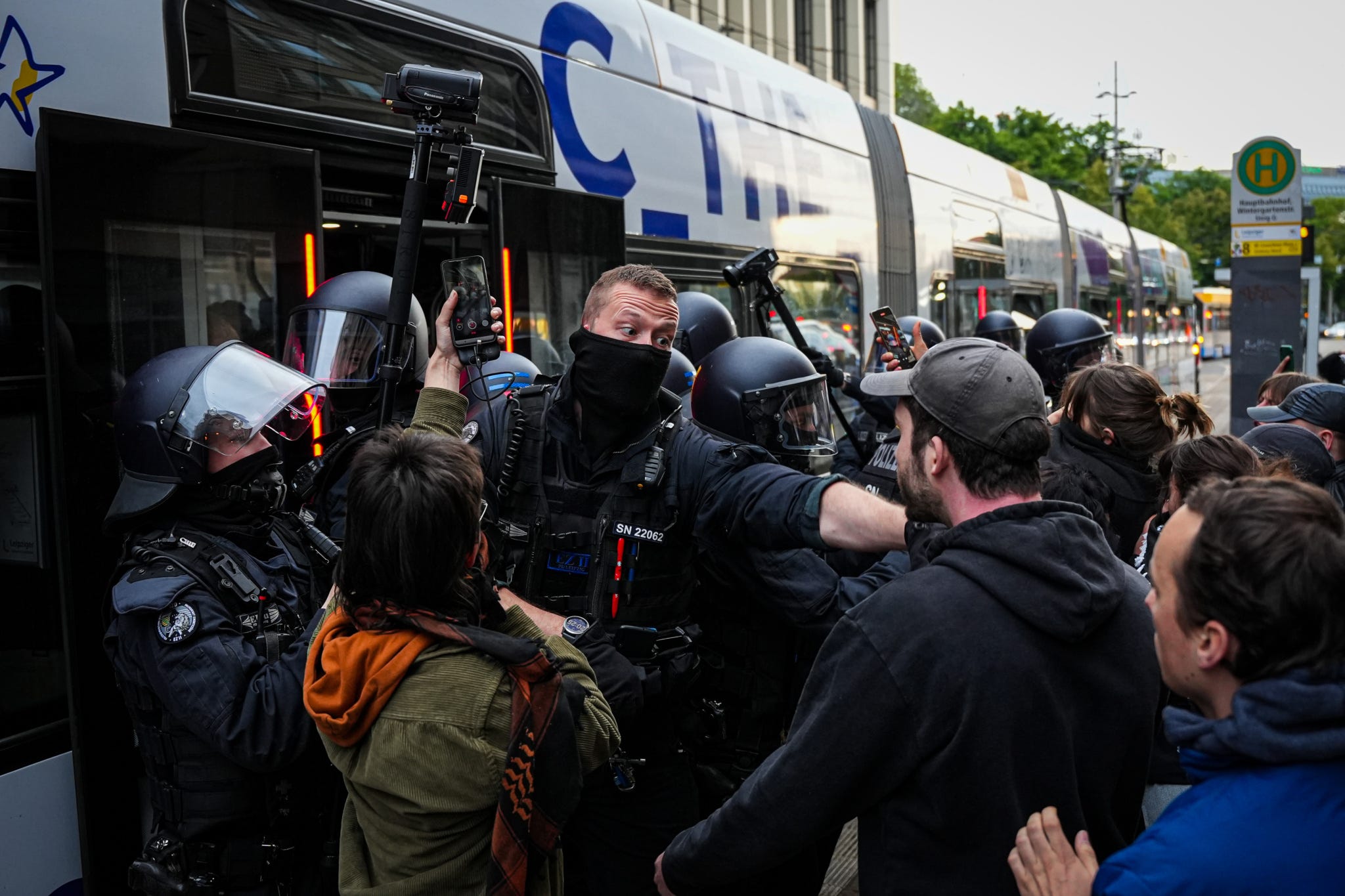 Einige Demonstrierenden wollten einer drohenden Einkesselung entgehen und flüchteten in eine Straßenbahn. Rund 20 Fahrgäste waren bereits an Bord, die Situation war angespannt. Doch es blieb nicht unbemerkt: Die Polizei riegelte die Bahn ab.