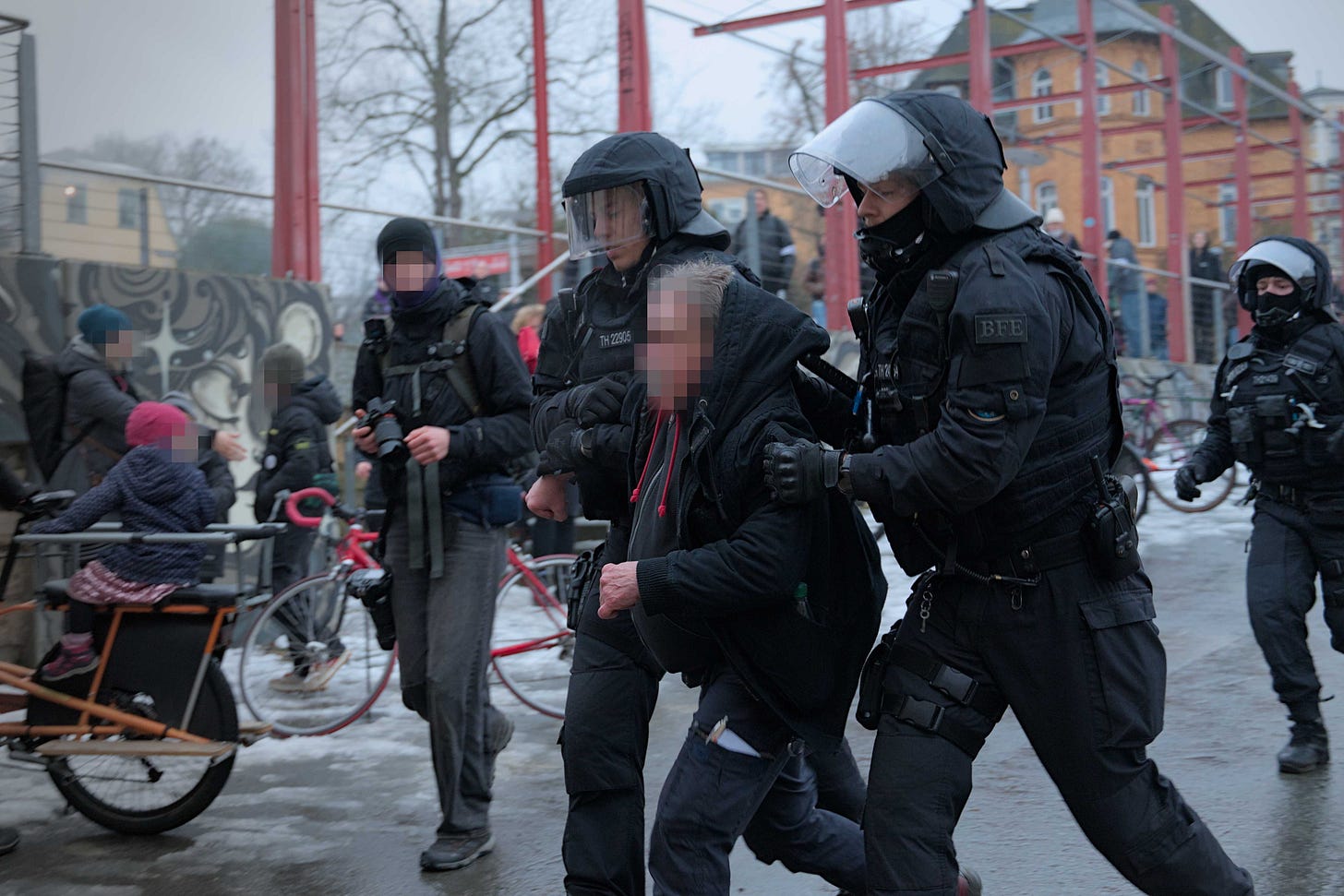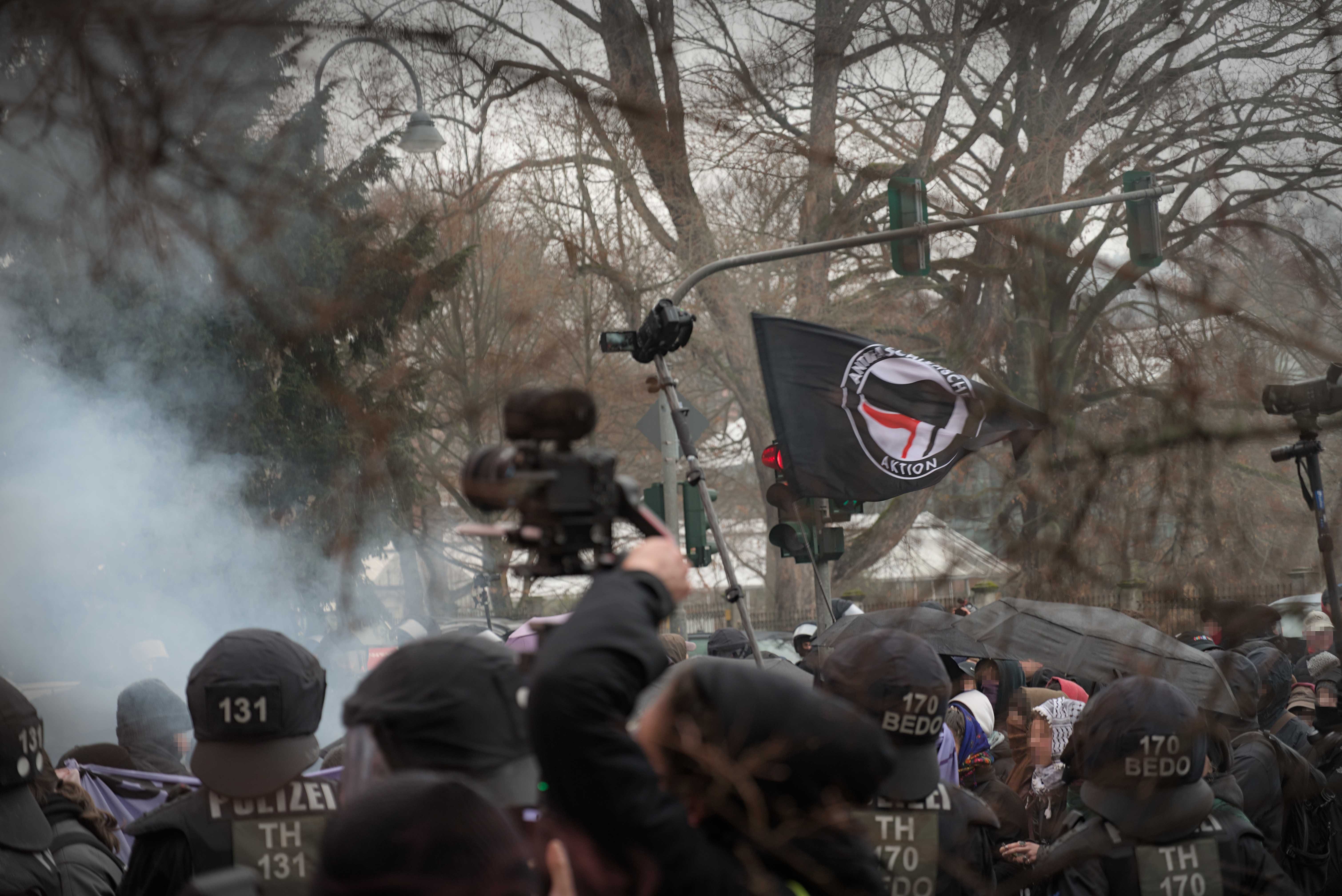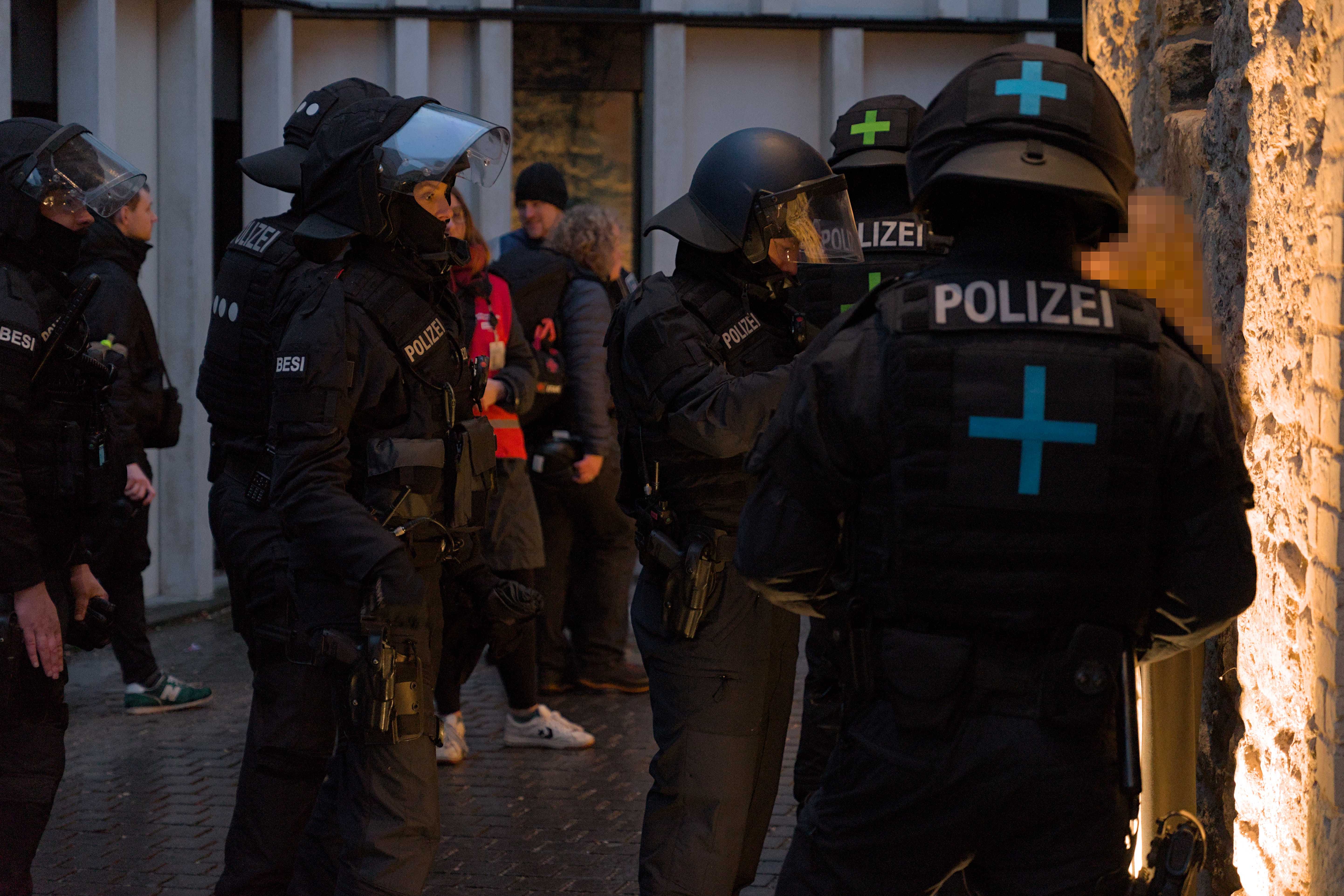 Auf der Endkundgebung nahmen die Beamten der Beweissicherungs- und Festnahmeeinheiten (BFE) sich schließlich einen Rentner und zwei junge Menschen vor. Unter Schneeballbeschuss zogen die Polizisten diese um eine Häuserecke, um ihre Personalien aufzunehmen und Anzeigen zu schreiben. Der ältere Herr habe angeblich einer der vielen Polizeikameras den Mittelfinger gezeigt. Dies werteten sie als “Beleidigung” gegen den Polizisten, der die Kamera hielt. Dass das Filmen mehrfach als Provokation kritisiert wurde und die Kameras als quasi eigenständige Objekte, stets mehrere Zentimeter bis zu einem Meter über den Polizisten gehalten werden, wurde einfach ignoriert.