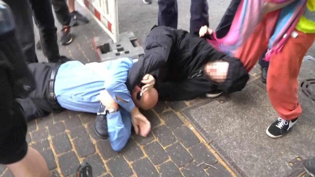 Hrdy und weitere Personen gingen zu Boden. Auf den Aufnahmen ist zu sehen, wie er sich am Bein eines Mannes festhält und dann zubeißt. Einer Zeitung, die zum Achsel-Springer-Verlag gehört, sagte er, jemand habe ihm von hinten in die Wade getreten, er sei gestürzt und dann seien mehrere Personen „auf mir drauf“ gewesen. Er habe dem Mann aus Notwehr ins Bein gebissen, nachdem dieser ihm zuvor ins Gesicht getreten habe.