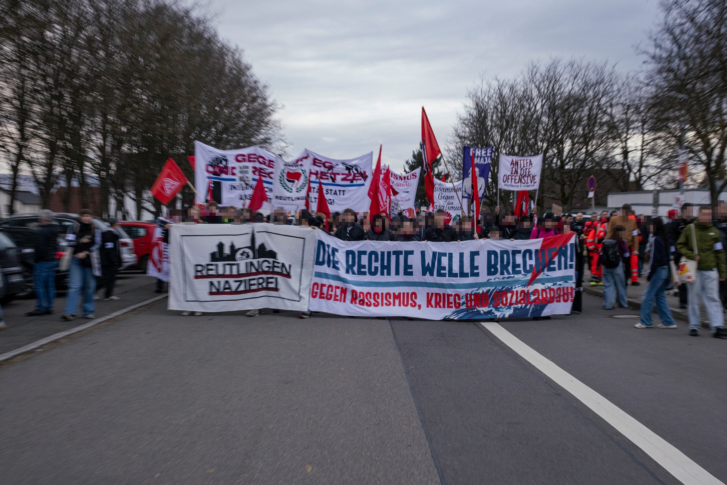 Draußen, vor der Halle zeigt sich ein anderes Bild. Transparente, Fahnen, selbstgemalte Schilder. Sprechchöre, die sich überschlagen: „Alerta, Alerta, Antifascista“, „Es gibt kein Recht auf Nazipropaganda“. Ein breites Bündnis aus Gewerkschaften, linken Gruppen, antifaschistischen Initiativen, kirchlichen Kreisen, migrantischen Organisationen. Menschen jeden Alters. Studierende neben Rentner:innen, Eltern mit Kindern auf den Schultern, Jugendliche mit frisch gemalten Plakaten, Menschen, die schon vor Jahrzehnten gegen Neonazis auf der Straße standen. Reutlingen zeigt Gesicht. Und Reutlingen weiß, warum.